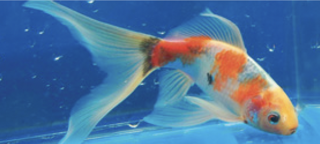 The hardy goldfish called shubunkin is known for its “calico” colours – the name translates variously as red brocade or deep red with different colours. The shubunkin was developed in Japan and the three different types distinguishable today—Japanese/American, London and Bristol shubunkin goldfish—can be identified by their different tail shapes.