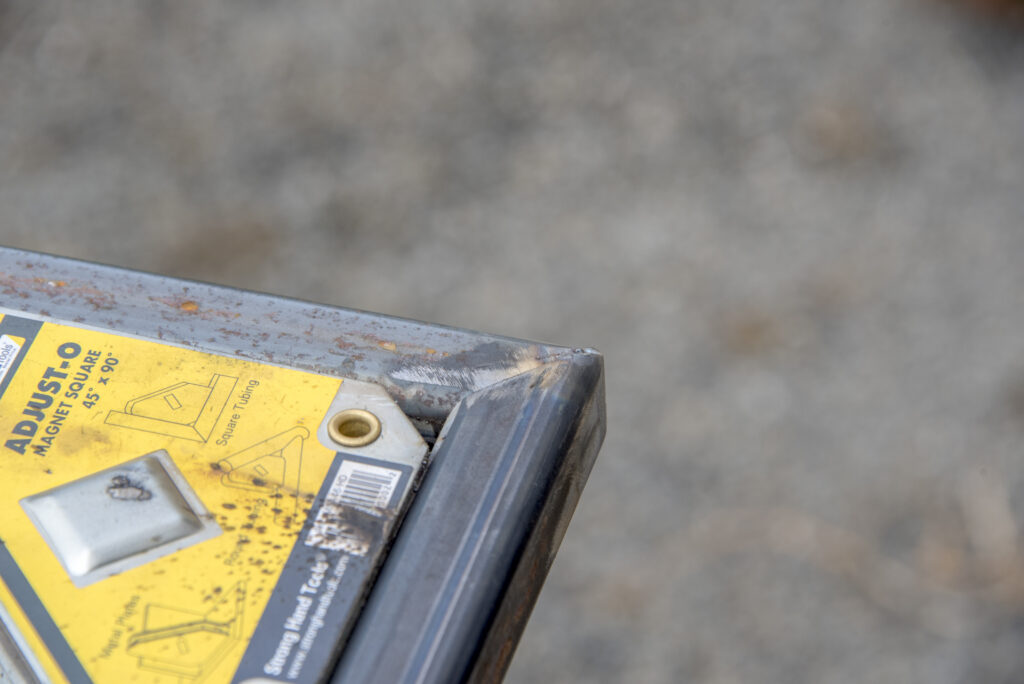 The sides were uneventful. I cut them to size, squared them up, stitched them together, and welded the ends. I have found that welding the outside edge of the mitre joint once you have the pieces tacked helps to prevent any distortion. The weld as it cools pulls the ends together but doesn’t tend to distort the joint.