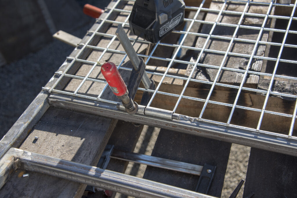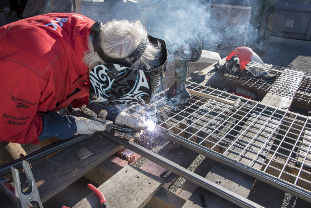 With the seams welded and cleaned up, I set the piece upright so I could weld the inside seams. Then it was simply a matter of placing the mesh, cutting it to size, and tacking the mesh to the frame. That took a bit of fiddling with the wire feed to get the right setting without burning through the 4mm wire of the mesh.