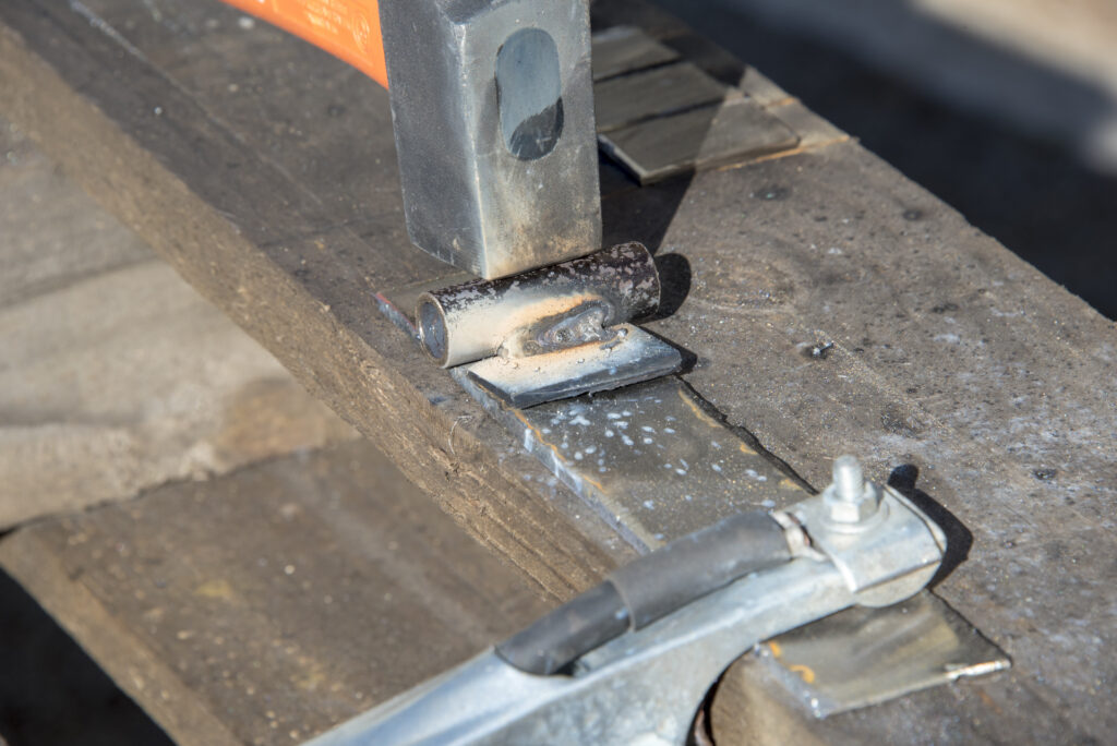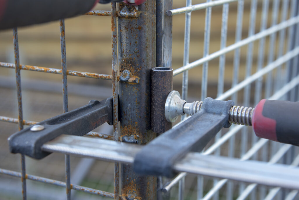 I then tackled the hinges to hold the various elements of the cage together. I want to be able to remove this cage and store it so I used the same sort of pipe hinge that I used on the door on the sides – one pipe attached to one of the frames, and the other attached to a short steel extension attached to the side or end.