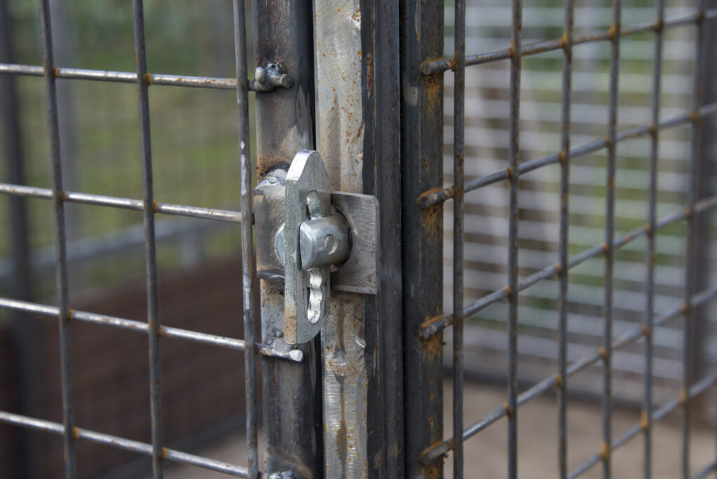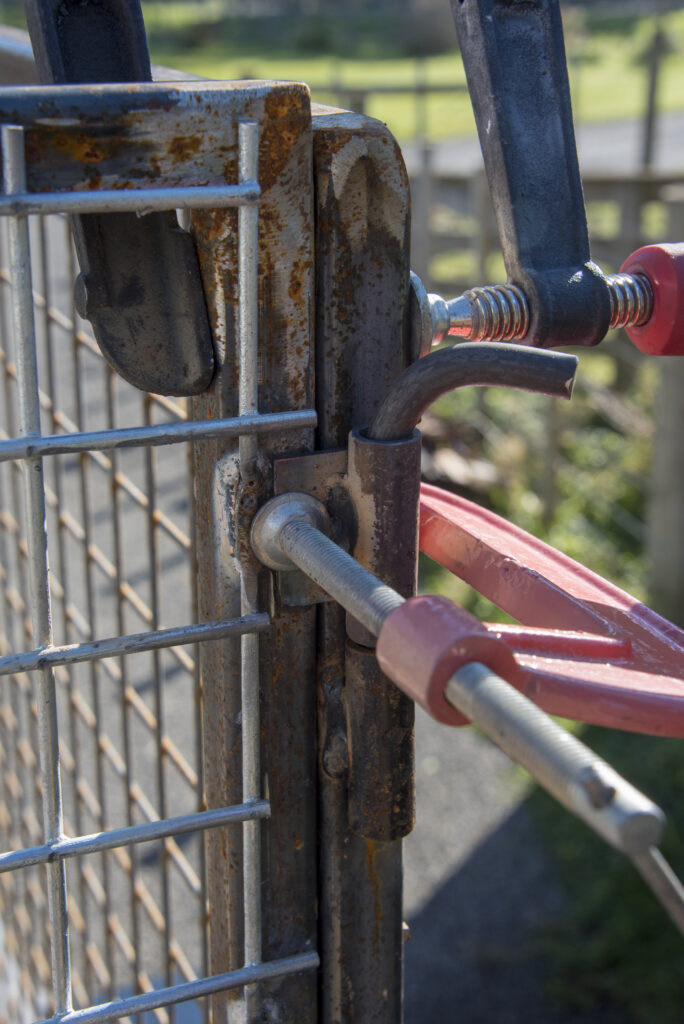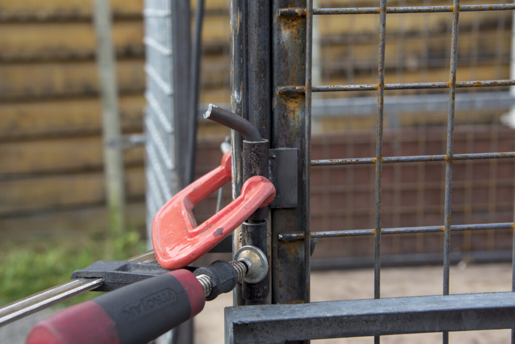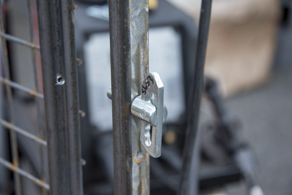 I intended to keep the door latched with a simple anti-latch drop lock as commonly found on trailers. The one I bought was meant to be screwed on, but that wasn’t going to be practical, so I drilled a hole large enough to accept it and tacked it in place while I cut the end flush with the cage end and welded it in place. You can in fact buy weldable locks but my supplier didn’t have any with a long enough tail. For the hasp, I cut a 20mm hole in a scrap piece of 3mm mild steel that I then welded to the door.