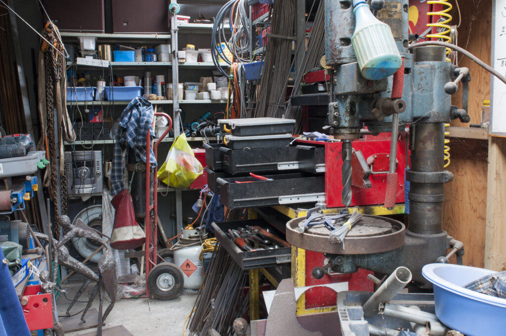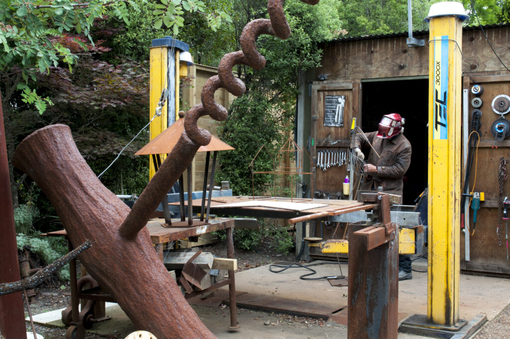 Allan has built everything on the property himself, from the house, sheds and a cob cottage to the garden furniture, sculptures and machinery needed to create them. His central piece of equipment, outside his welding apparatus, is an old car hoist fitted with a crane-like device that enables him to lift up his sculptures and work on them at a comfortable height. “I bought the winch and track and made my own arm. It grunts and groans but does the job.”