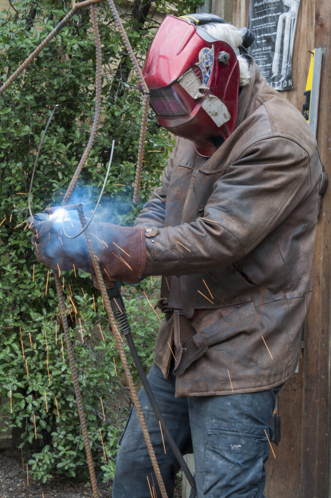 Steel is dripped over the framework using a MIG torch welder, the “hot-glue gun” of welding. “You couldn’t do this with an arc welder. It would take forever.” The gun is threaded with copper-coated steel wire to limit rusting and he runs it on CO2 as a cheaper alternative to an argon shield.