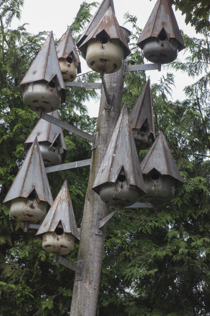 Allan, who loves birds, is happy to accommodate them in his garden. Old gas bottles are put to good use as high-rise condominiums for starlings. He made each unit by cutting a hole in the side of the bottle and “sticking a wee roof” on top, then mounted them on a pole. “They used to nest in my shed but they don’t come anywhere near it since I made that.”