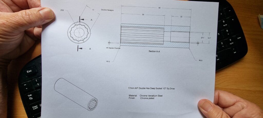 In the previous articles, we have created a 17mm A/F half-inch drive deep socket and then changed it slightly to create a socket that’s the same, but with double hex instead of single. This time we are going to make a 2D conventional drawing of the socket. This is very easy. By accessing the file of the part you have created, most of the work is already done.