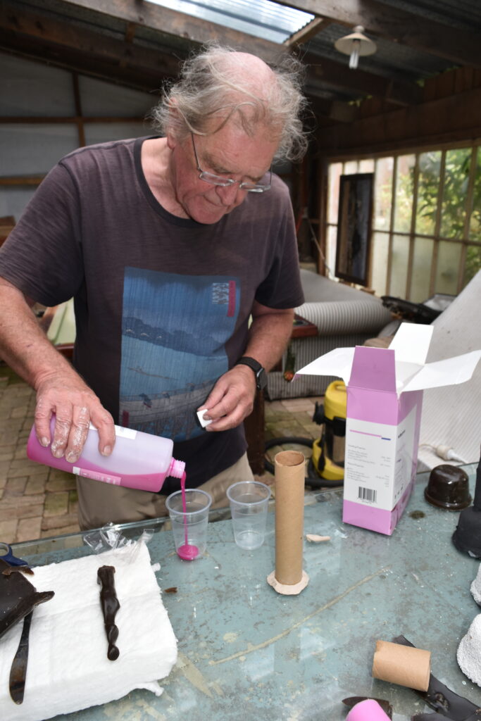 “Reid is a master bronze caster and sculptor who has perfected a much more accessible way of casting the molten metal, both in foundries and in his workshop. David’s shed — close to the sea and bush at Sandy Bay — used to be a potter’s workshop, complete with a brick, wood-fired kiln. He has no permanent foundry as such, but will build it as we go through the process of learning to sculpt, mould, and cast a small, abstract bronze sculpture.”