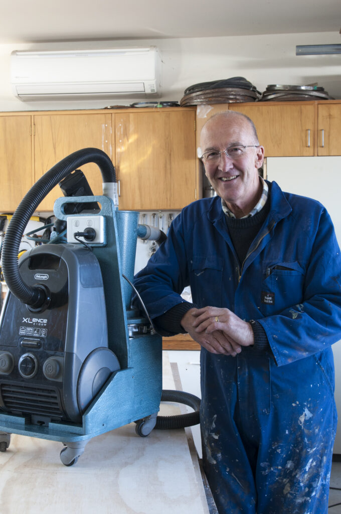 To keep dust under control, I have fitted each of my woodworking machines with its own mini cyclone and vacuum system. This means that when I need to move machines about to create a workspace, the dust collection continues to work.
