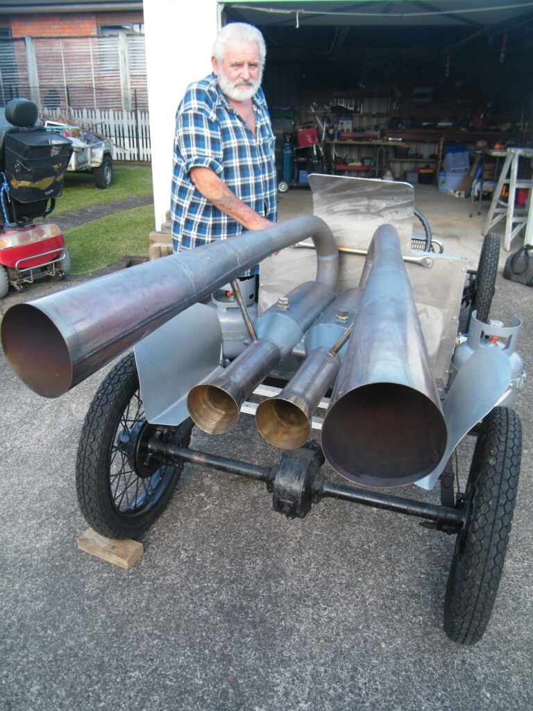 Sheds are not just for repairs and projects, they are also places where sheddies can let their imaginations run wild and create whatever their hearts desire. Colin Brookes is a man of many talents. If it’s “been there and done that”, he pretty much qualifies. As a child living in London during the WWII blitz he was haunted by the flying bombs aimed at his city by the German war machine. These flying bombs called ‘doodlebugs’ were powered by pulse-jet engines. Coming full circle, Colin decided to use a pulse-jet engine to power a contraption he built in his shed, a jet buggy.
