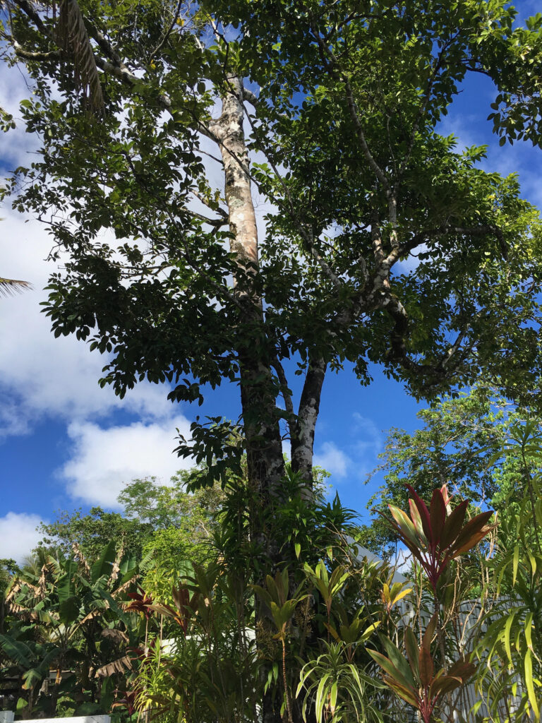 “A sign, ‘Ebony Carver,’ points the way through lush Niuean tropical forest to the shed where master carver, Jack Feleti, crafts exquisite ebony pendants, bracelets, ornamental hair combs, 21st birthday keys, decorative weapons, and other treasures.