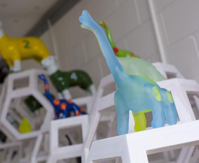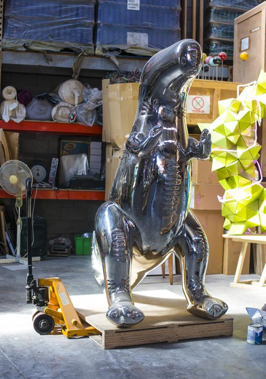 A substantial, polished stainless steel dinosaur standing in the studio will be part of an exhibition at Gow Langsford Gallery later this year. “There’s a lot of work involved in making these sculptures,” Gregor explains. “They are so highly finished that people tend to think that a machine has made them. They often don’t realise the complexity and the cost involved in producing pieces. Some of my work involves processes such as lost wax casting. Others need to be welded, then there’s all the grinding and polishing needed to achieve the highly finished look.”