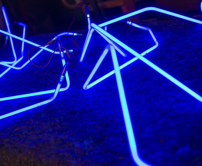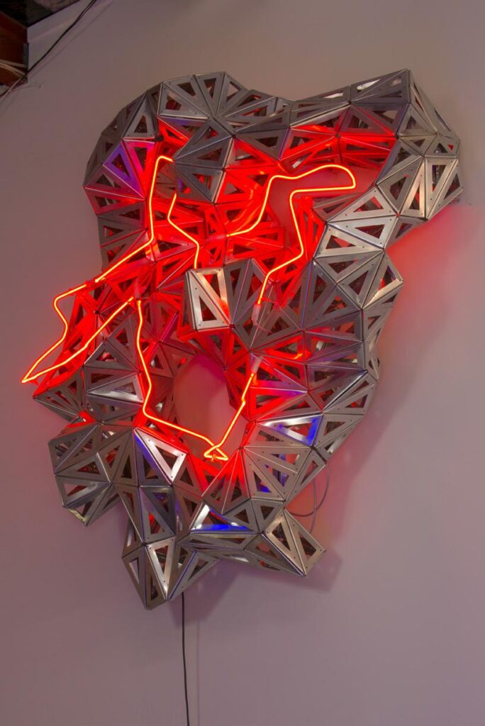 Gregor says he has gained a lot of knowledge over the years of working with different mediums. The neon tubes he uses in some of his sculptures are a case in point. He works on the straight tubes, “bending” them into a variety of forms so that they seem at one with the sculpture that they are illuminating. “Pumping the neon is very skilled and complex work,” he says. “You are working with argon gas at 8000v so you have to be very careful. It’s best not to touch the wires at the end of each tube otherwise you’ll get zapped,” he says laughing.